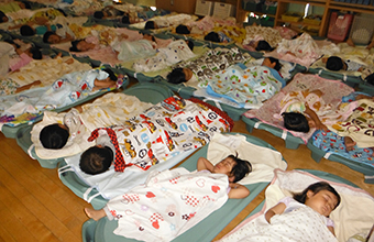 - ゆったりとした時間の中、保育教諭の膝の上での絵本読み聞かせや、全体での読み聞かせは、絵本の世界に浸ったり、言葉遊びにつながるなど、言語能力が高まります。